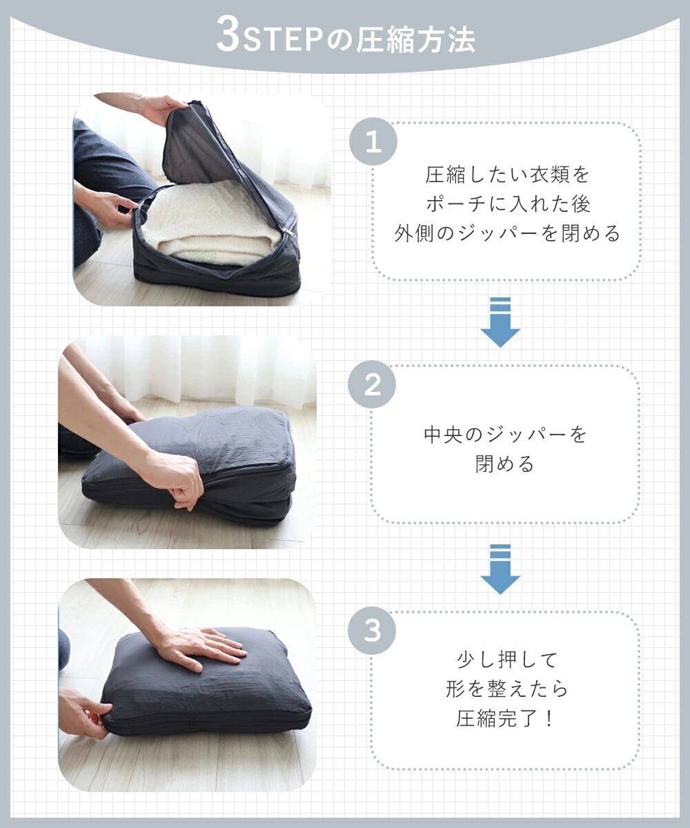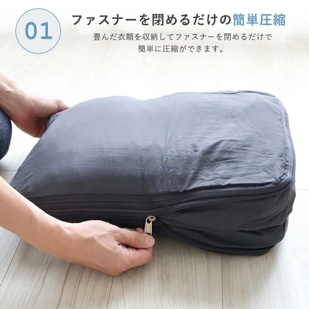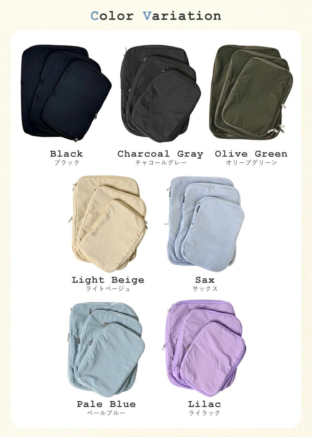 【商品説明】 ファスナーを閉めるだけで簡単に圧縮できる、 旅行用の圧縮収納ポーチ3点セットです。 衣類を入れてファスナーを閉めるだけで、 かさばる服をコンパクトに収納できます。 空気抜き不要なので、誰でも簡単に使えます。 サイズ違いの3点セットで、 トップス・ボトムス・下着などを分けて収納可能。 スーツケースの中がすっきり整います。 軽量で丈夫なナイロン素材を使用し、 汚れても洗えるため、繰り返し使えて経済的。 【仕様】 セット内容:圧縮ポーチ3点セット 素材:ナイロン 用途:衣類収納 / 旅行用パッキング 使用シーン:旅行・出張・帰省 【仕様】 セット内容:圧縮ポーチ3点セット 素材:ナイロン 用途:衣類収納 / 旅行用パッキング 使用シーン:旅行・出張・帰省 カラー:ブラック/オリーブグリーン/ライトグレー/サックス/グレージュ/チャコールグレー/ライトベージュ/ペールブルー サイズ:Sサイズ:30cm×20cm×4cm Mサイズ:35cm×25cm×4cm Lサイズ:40cm×30cm×4cm 荷物を減らして、移動をもっと快適に。 実用性重視のトラベル圧縮ポーチです。